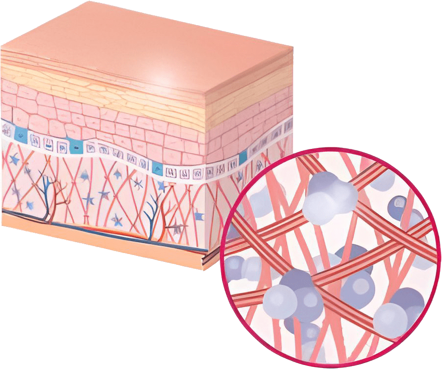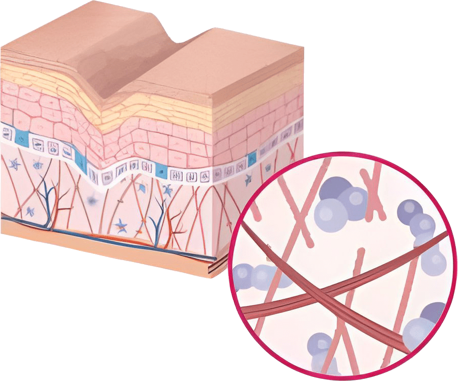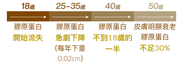 膠原蛋白存在於真皮層之中,是支撐肌膚的重要關鍵,有助肌膚保持緊緻而有彈性。然而,年紀遞增,會引致身體失去自生膠原蛋白的能力,使原有的膠原蛋白纖維漸漸缺乏彈性,緊緻飽滿不再,膚質亦會變差。